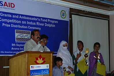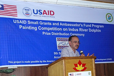 Mr. Aftab Rana, President of STFP and Team Leader of Indus Dolphin Ecotourism Project in his multimedia presentation informed the audience that the Indus Blind Dolphin is one of the world's rarest mammals and the most endangered freshwater river dolphin in the world. He informed that approximately 1400 blind dolphins exist today in the central and lower reaches of the Indus River in Pakistan. He said that the population of this species has gradually declined because of various factors, including water pollution, poaching, fragmentation of habitat due to barrages, and dolphin strandings in the irrigation canals. He said Indus Blind Dolphin is struggling for its survival in the waters of Indus River and it is a fact if no major efforts have been made to save these dolphins it could become extinct in couple of years. He also appreciated the interest of students in this painting competition and congratulated the winners.